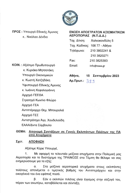 Επιστολή ΕΑΑΑ σε Πολιτική και Στρατιωτική Ηγεσία/Απονομή Συντάξεων σε Γονείς Εκλιπόντων Πιλότων της ΠΑ από Ατυχήματα