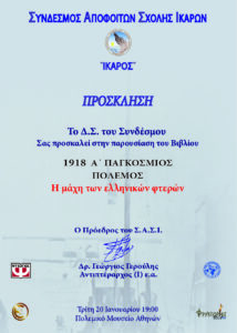 Στις 20 Ιανουαρίου 2026, και ώρα 7.00 μ.μ. θα γίνει βιβλιοπαρουσίαση στο Πολεμικό Μουσείο Αθηνών υπό την αιγίδα του Συνδέσμου Αποφοίτων Σχολής Ικάρων (Σ.Α.Σ.Ι), του έργου 1918 Α΄ Παγκόσμιος Πόλεμος. Η μάχη των ελληνικών φτερών, (συγγραφείς Παντελής Βατάκης και Κωνσταντίνος Λαγός, εκδόσεις «Ψυχογιός»).