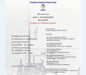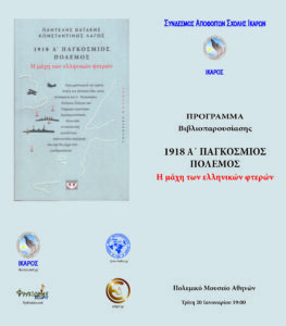 Στις 20 Ιανουαρίου 2026, και ώρα 7.00 μ.μ. θα γίνει βιβλιοπαρουσίαση στο Πολεμικό Μουσείο Αθηνών υπό την αιγίδα του Συνδέσμου Αποφοίτων Σχολής Ικάρων (Σ.Α.Σ.Ι), του έργου 1918 Α΄ Παγκόσμιος Πόλεμος. Η μάχη των ελληνικών φτερών, (συγγραφείς Παντελής Βατάκης και Κωνσταντίνος Λαγός, εκδόσεις «Ψυχογιός»).